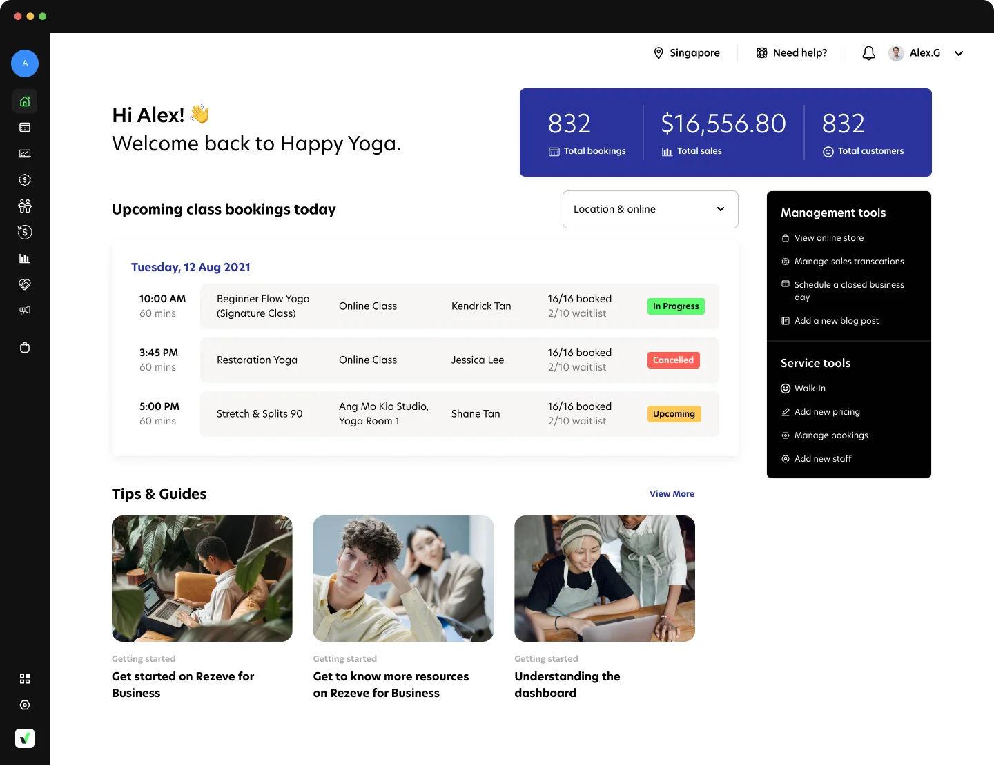 Rezerv’s Report Dashboard is structured around how fitness businesses actually operate. Reports are organized across Sales, Classes, Customers, Pricing Plans, Finance, and Operations, so you can move from high-level trends to specific details without jumping between tools or exporting files.